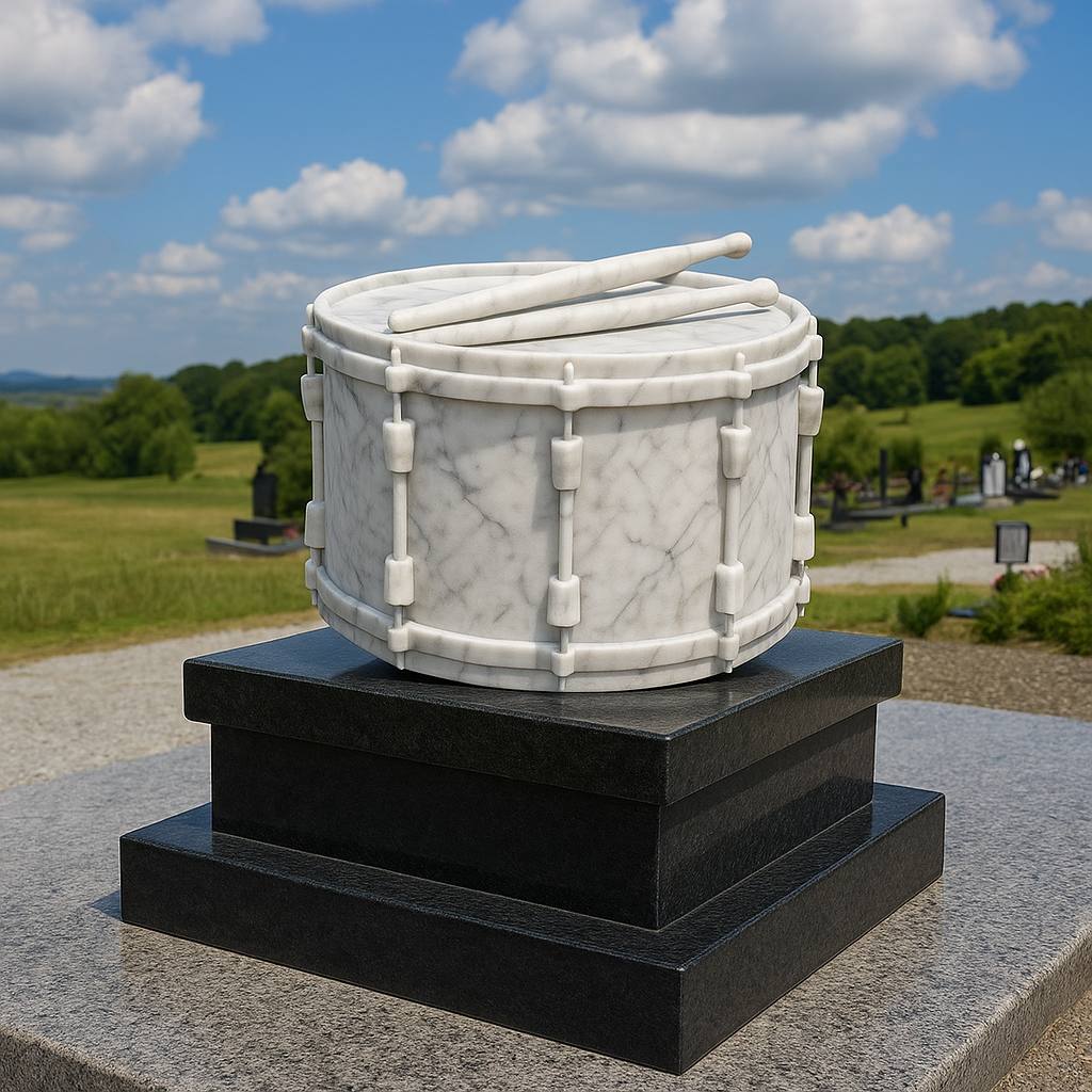 Барабанні установки перетворюємо на справжні скульптурні групи: бас-бочка, томи, тарілки, педаль – все з граніту й бронзи. Поверхню тарілок робимо блискучою, як метал. Така атрибутика на пам’ятники для музикантів виглядає вражаюче на великих ділянках Правобережного, Південного чи Таромського кладовищ.