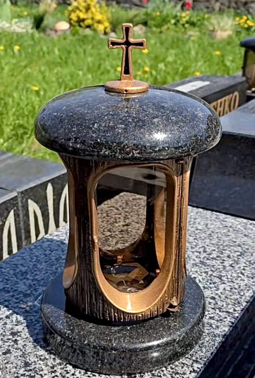 Бронзові лампадки відливаємо вручну з подальшим патинированием – вони набувають благородного темно-зеленого або шоколадного відтінку. Можна додати позолоту на хрест чи напис «Вічна пам’ять». Бронза з роками тільки гарнішає, тому лампадки на пам’ятник з цього металу виглядають дедалі шляхетніше.
