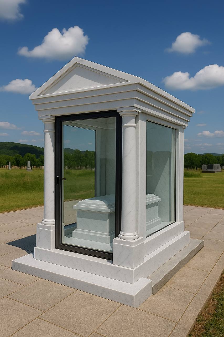 Зовні склеп для родини облицьовується суцільним гранітом чи мармуром, дах робимо монолітним або з мармуровим куполом, двері – литі бронзові або масивні гранітні з різьбленням. Всередині – мармурові стіни й підлога, ніші для лампадок, вентиляція, гідроізоляція найвищого класу, мармурові лавки, вівтарна частина, місце для ікон чи сімейного герба.
