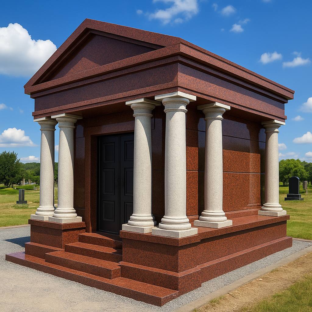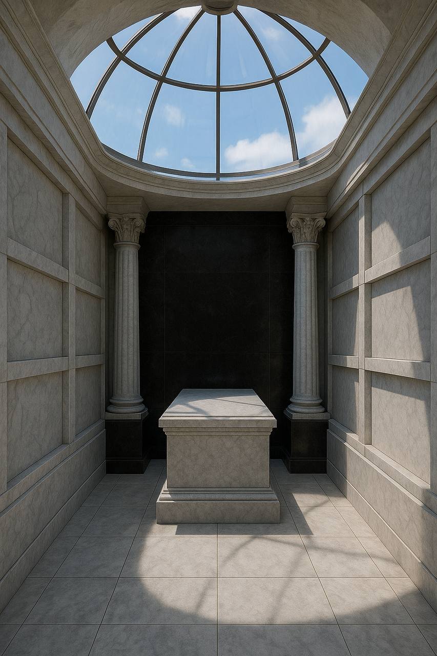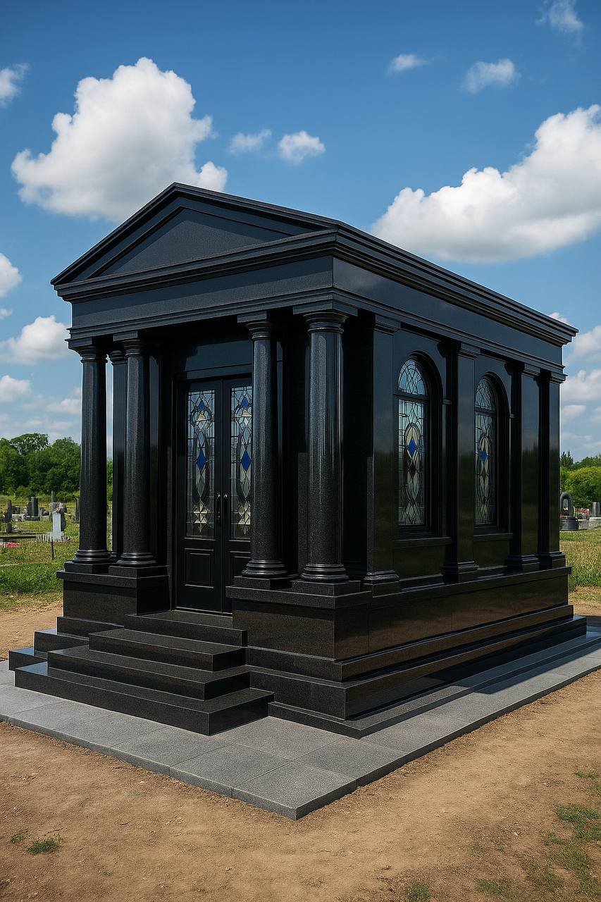Ми проєктуємо й будуємо склепи з граніту будь-якої архітектури: класичні прямокутні каплиці з хрестом чи тризубом на даху, круглі або восьмигранні з куполом, напівзаглиблені, коли над землею залишається лише портал і дах, або повністю підземні з розкішними гранітними сходами. Розмір також будь-який – від компактного склепу на 4–6 місць до великої родової усипальниці на 12, 18 чи навіть 24 поховання. Форма може бути суворою мінімалістичною або пишною з колонами, арками й різьбленням – усе залежить лише від ваших побажань і розміру ділянки.